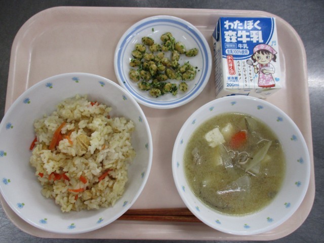 2月9日 こぎつねおこわ 豚汁 のり塩大豆 牛乳 公開日 2026/02/09 更新日 2026/02/09 給食 ≪献立≫●こぎつねおこわ●豚汁●のり塩大豆●牛乳≪使用食材・産地≫にんじん(千葉)、ごぼう(青森)、大根(神奈川)、じゃがいも(北海道)、長ねぎ(千葉)、鶏肉(宮崎)、豚肉(埼玉)、大豆(北海道) いいね(0)