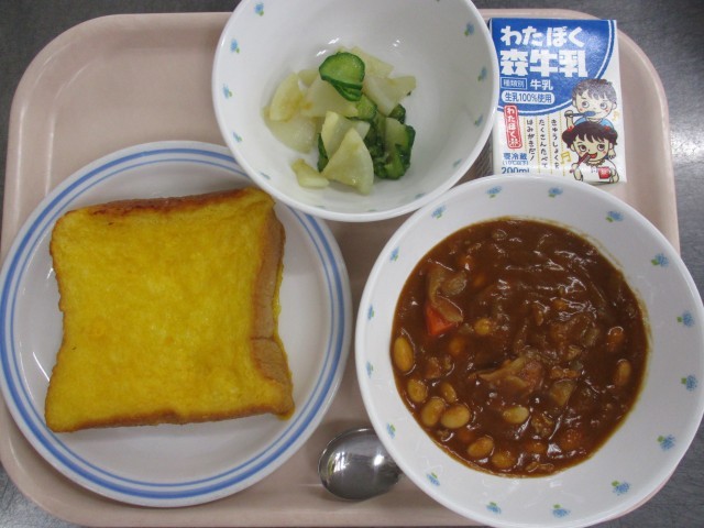 2月17日 オレンジフレンチトースト ビーンズシチュー かぶのサラダ 牛乳