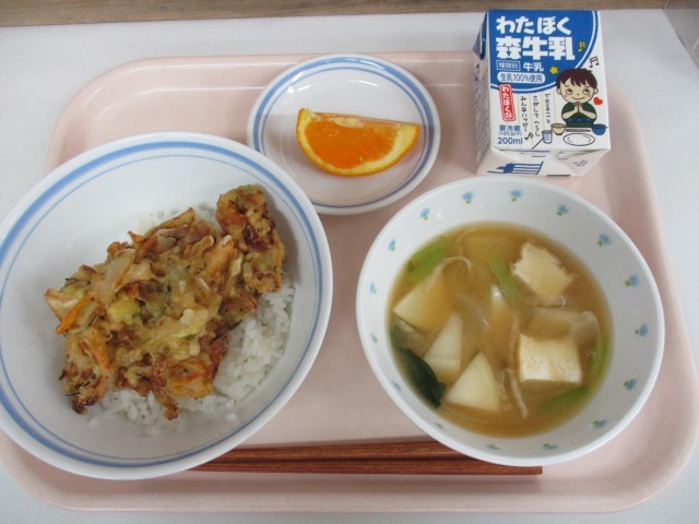 4月22日 春のかき揚げ丼 みそ汁 清見オレンジ 牛乳 公開日 2026/04/23 更新日 2026/04/23 給食 【献立】●春のかき揚げ丼●みそ汁●清見オレンジ●牛乳 ひとつひとつ手作業でかき揚げをつくりました。 いいね(0)