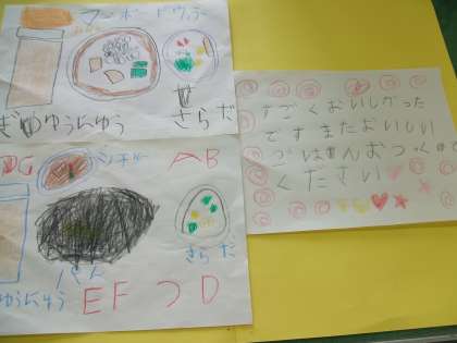 1年生からのプレゼント 公開日 2012/04/18 更新日 2012/04/26 今日のできごと 1年生がすてきな給食の絵を書いて、調理員さんへプレゼント してくれました。 とてもうれしいです。 いいね(0)