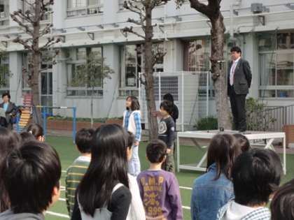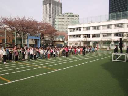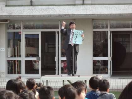 今週から1年生も全校朝会に参加し、全校児童がそろって全校朝会が行われました。