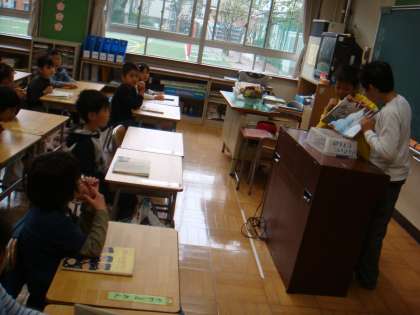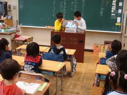 今日は、絵本の読み聞かせをしてくれました。しーんと聞き入る1年生。
