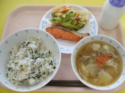 献立 :若布ごはん 豚汁 サケの照り焼き 中華風野菜 牛乳