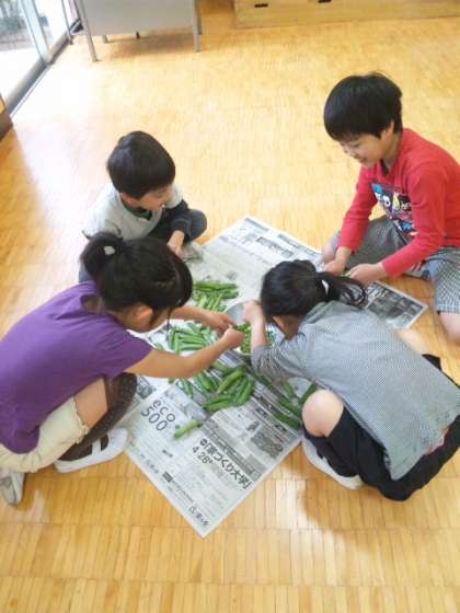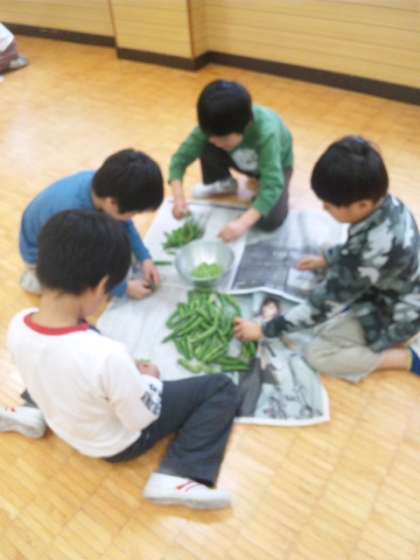 今日は2年生がグリンピースのかわむきに挑戦しました!みんな楽しくも真剣そのもの。栄養士さんの指導のもと、作ってくれた人の気持ちになってみんな 丁寧にグリンピースのかわをむいていました。
