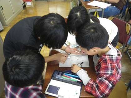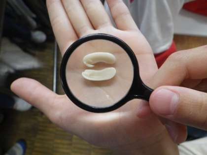 今日の理科は植物の発芽についての学習です。インゲンマメの種を割って観察すると「わー、これ、葉のものだよ。葉脈があるよ!」「こんなに小さな種の一つ一つに命のもとがつまってるみたい。すごいなぁ・・・」感動の声をあげながら、真剣に観察しました。