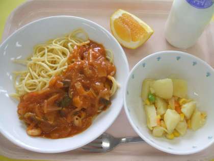 献立 :スパゲッティ海の幸ソース ポテトソテー 美生柑 牛乳