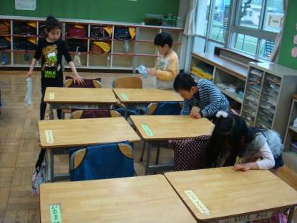 1年生も何かできることはあるはず!ということで、机とイスをぞうきんで拭くことに挑戦してみました。ぞうきんを水でぬらして、両手で、ぎゅ〜っとしぼって、きゅっきゅっとふいていきます。なんて上手なこと!びっくりです。6年生も「じょうずだね。」とほめてくれました。5月からは、6年生に弟子入りして、ほうきやごみすてにも挑戦していきます。ますます、はりきる1年生です。