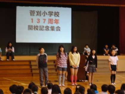 開校記念児童集会 公開日 2012/05/15 更新日 2012/05/15 専科 今日は菅刈小学校の137周年の開校記念日でした! 計画・代表委員会の児童たちが菅刈小学校の歴史を交えたクイズを入れながら劇をしてくれました。 最後にみんなで校歌を歌い、菅刈小学校の開校記念日をみんなでお祝いしました!! いいね(0)