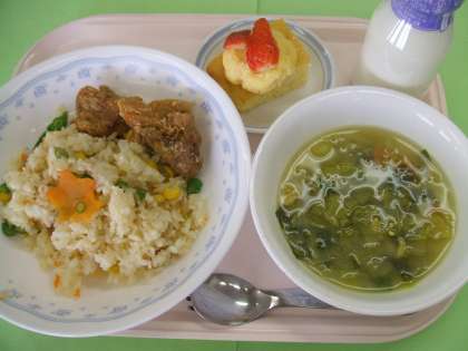 お楽しみメニュー 公開日 2009/12/25 更新日 2009/12/25 給食 12月25日(金) 今日は、冬休み前のお楽しみメニューです。 みなさんの大好きな鶏のから揚げと手作りケーキを用意しました。 ピラフの皿にから揚げを一緒にのせてください。 きれいに盛り付けて、おいしく食べましょう。 いいね(0)