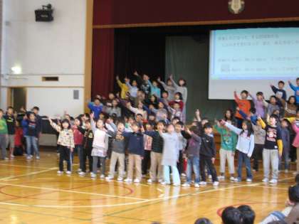 今日は1〜3年生から6年生に向けて「ひみつのプレゼント」が用意されていました。それは、卒業を控えた6年生に今までお世話になったお礼を込めて、手話を付けて「Smile Again」を歌うことでした。生き生きと踊るように手話をつけながら歌いました。