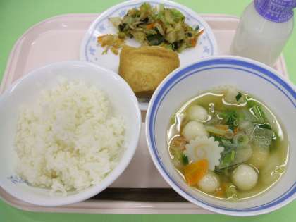 給食では、もちのかわりに白玉団子を入れた