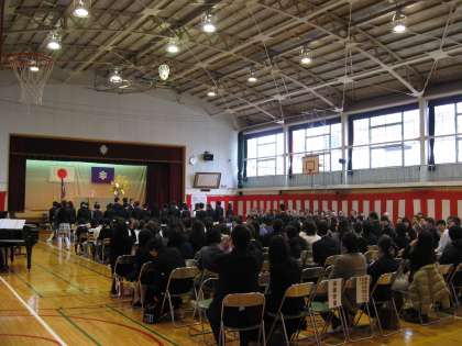 卒業生38名は、呼びかけや歌に6年間の思いを込めました。それは会場の体育館に響き、出席した人々の心に届きました。式が終わり、退場する卒業生は、やり遂げた喜びに満ちた表情をしていました。