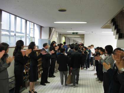 校舎を後にする卒業生を在校生や保護者、教職員が拍手で送りました。昇降口でクラスメイトと写真を撮ったり、教職員と話をしたり、思い出深い校舎を出るのが名残惜しい様子でした。