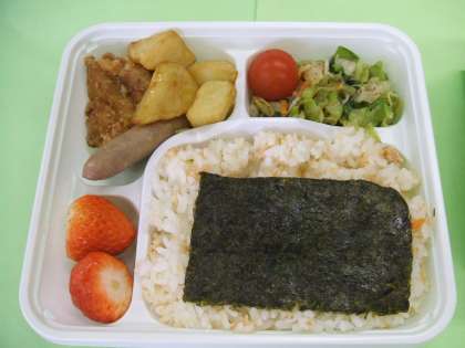 鮭のり弁当 公開日 2010/02/18 更新日 2010/02/18 給食 2月18日(木) 今日は、たてわり班給食です。 じぶんの弁当とお茶をビニール袋に入れて、 たてわり班で食べる教室に行きましょう。 <献立> 鮭のりごはん 鶏肉の唐揚げ ウィンナーソテー カントリーポテト おかかサラダ ミニトマト いちご お茶 いいね(0)