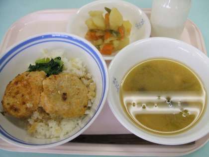 4月9日(金) 公開日 2010/04/09 更新日 2010/04/09 給食 今日は、つくね丼です。 甘辛いたれをかけた鶏肉の団子をご飯にのせて食べます。 つくねの下にある野菜は、チンゲンさいです。 つくねと一緒にご飯にのせてチンゲンさいも残さず食べてください。 ご飯、つくね、チンゲンさいを3つ合わせて「つくね丼」です。 献立:つくね丼 なめこのみそ汁 じゃが芋のうま煮 牛乳 いいね(0)