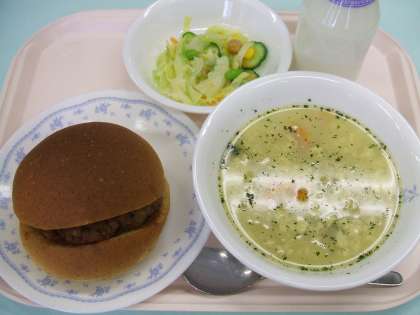 4月12日(月) 公開日 2010/04/14 更新日 2010/04/14 給食 今日はヘルシーバーガーです。 ハンバーグには、たっぷりの玉ねぎとひじきや豆腐を混ぜてあるので さっぱりして栄養満点です。 ヘルシーは英語で「健康」という意味です。 おいしく食べて、健康で元気な体になりましょう。 献立:ヘルシーバーガー ふわふわ玉子スープ ビーンズサラダ 牛乳 いいね(0)