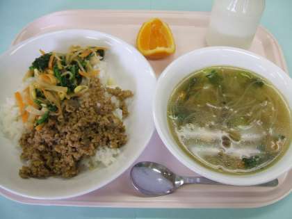 4月14日(水) 公開日 2010/04/16 更新日 2010/04/16 給食 ビビンバは、給食の人気メニューです。 ごはんに合う、甘辛い肉みそが特に人気ですが、実はこの肉みそには 野菜もたっぷり入っています。 しょうがやにんにく、長ねぎ、たけのこなどを細かく切って 肉と一緒によく炒めると甘くなります。 野菜の力で、肉みそがおいしく仕上がります。 献立:ビビンバ ビーフンスープ 清見オレンジ 牛乳 いいね(0)