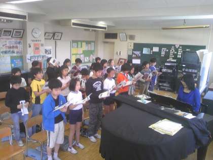 今日は6年生の音楽授業。さすがに6年生になると発声の仕方も上手で、なかなか美しい響きが聞こえます。