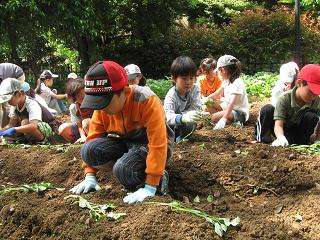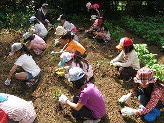 5月13日(木)菅刈公園の畑に、サツマイモの苗を植えました。葉っぱを3・4枚残して、くきを横にして土の中に埋めました。10月〜11月頃に収穫できるそうです。草むしりや、つる返しなどをして、これから一生懸命育てていきたいと思っています。