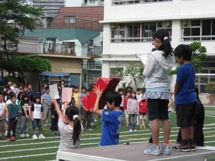 本日5月10日(月)の朝会で、代表委員の子どもたちが「運動会のマスコットキャラクター募集」を呼びかけました。