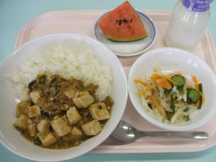 5月13日(木) 公開日 2010/05/17 更新日 2010/05/17 給食 給食では、今年はじめてのスイカです。 やさいやくだものは、お店にでてきたばかりののころを 「はしり」の次期といいます。 その年、はじめて食べるものを「はつもの」といいます。 スイカはこれから暑い夏になると、たくさんできておいしくなりますね。 今日は一足早く、初夏の気分を味わいましょう。 献立 :マーボー豆腐丼 大根サラダ スイカ 牛乳 いいね(0)
