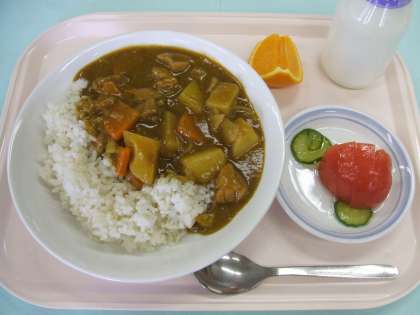献立 :チキンカレーライス トマトときゅうりのサラダ 清見オレンジ 牛乳