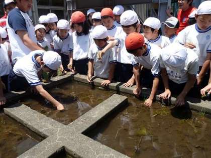 今日は、宮城県角田市の皆様をお迎えし、田植え体験と稲作に関する学習を行いました。やはり教科書で学習するより、実際に田植えを行ったり話を聞いたり質問したりする本物にふれる学習は子どもたちを引きつけます。どの子も真剣な表情で学習に取り組んでいました。