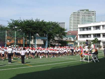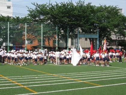 整列のしかた(「気を付け」「休め」の姿勢も含め)、入場行進(左足から踏み出す、曲のリズムに合わせるなど)の練習と、応援合戦の練習をしました。格好よく行動することや、気持ちを込めて自分のチームを応援し盛り上げることを学ぶ、いい練習でした。