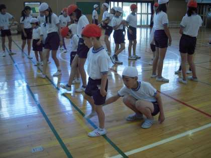 今日は1時間目に6年生が全校ダンスのステップを教えてくれました。1年生1人に、6年生が2人もついて、教えてくれます。