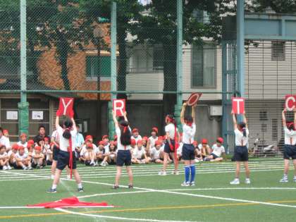 地球運び(大玉送り)は、練習なのに本番のような戦いでした。赤白両チーム1勝ずつで、本番が楽しみです。午後の部の応援合戦の練習は、昨日よりも声が出て、応援に熱が増してきました。全校ダンスは、上級生が下級生の手を取って教える姿が微笑ましいです。