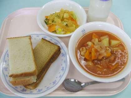 献立 :2色サンドイッチ ミートボールスープ パリパリサラダ 牛乳