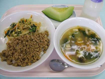 7月15日(木) 公開日 2010/07/15 更新日 2010/07/15 給食 ビビンバは、韓国の「まぜごはん」です。 肉や野菜をごはんにのせて、混ぜながら食べるとおいしいです。 甘辛くて、ピリッとした味付けなので、蒸し暑い季節でも、 もりもり食べられます。 「暑くてだるいなあ」と思っている人も、少しがんばって、給食をしっかり食べると 午後の元気がでます。 献立 :ビビンバ 中華スープ メロン 牛乳 いいね(0)