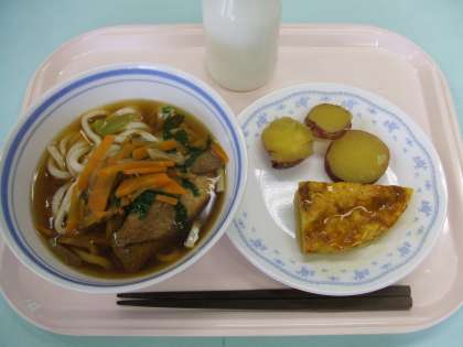 献立 :冷しきつねうどん たまごやき さつま芋の甘煮 牛乳