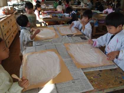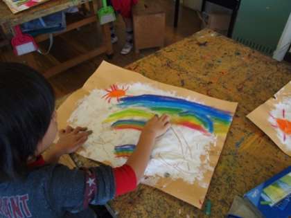 金曜日の図工では、茶色の画用紙に白い液体で模様を描いたものに、パステルで色を付けていきました。