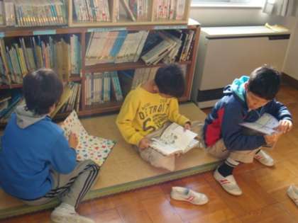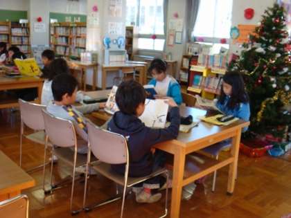12月の図書室に、入ってみると・・・。中にはクリスマスのかざりつけが・・・。なんだか、あたたかい気持ちになります。おまけに、あたたかいひざしも差し込んできて、ぽかぽかいい気持ち。4年生の子どもたちは、すぐにしーんと本を読み始めました。映画を見たのか、ハリーポッターの本を探す子。友達の読んだ本を、今度は借りてみようかと話す子。畳のところに座って、じっくり読みふける子。いろいろですが、本の世界に入って、心をおどらせるのは、わくわくするひとときです。