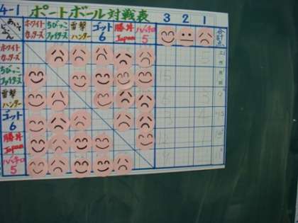 4年生は体育でポートボールにとりくんでいます。ボールをキャッチして、パスし、シュートする、なかなかむずかしい動きです。これは、5,6年生のバスケットボールにもつながっていく動きです。6チームは、自分たちでチームの名前やかけ声を考えました。優勝は「ちびっこファイターズ」でしたが、他のチームもチームワーク良く、最後までがんばりました。