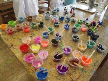 今年最後の図工では、絵の具を混ぜて、すてきな色をたくさん作りました。