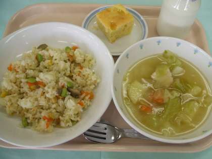 献立 :シーフードピラフ 野菜スープ パインケーキ 牛乳