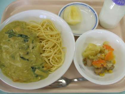 1月20日(木) 公開日 2011/01/21 更新日 2011/01/21 給食 今日のスパゲッティには、ほうれん草が入っています。 ほうれん草は一年中ありますが、寒い冬のほうれん草が一番おいしくて 栄養もたっぷりです。 寒い季節は、暑い時期よりゆっくり成長します。 その間に土の中の栄養や太陽の光をじっくりたくわえることができます。 甘くておいしい冬のほうれん草を食べてください。 献立 :スパゲッティカレークリームソース ウィンナーポテト りんご 牛乳 いいね(0)