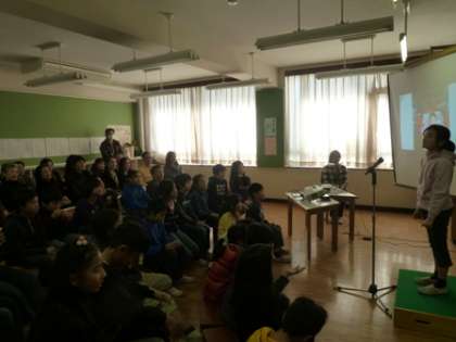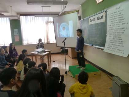 4・5校時を使って、4年生は1/2成人式を行いました。あいさつと歌で幕を開け、その後、一人一人の小さい頃の写真をみて誰だかあてるゲームをしながら、自分の家族への思いや将来の自分について、一人一人が発表をしました。感動の連続で保護者の方の中に涙する姿がありこちに見られ、おもわず私まで・・・・という感じでした。