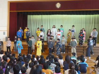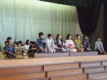 もちろんその中には、国語で学習した「言葉遊び」が含まれています。落語家さんに扮した子どもたちの口から、「回文」や「なぞかけ」が飛び出すたびに、体育館からは「ほおー。」とか「おおっ。」といった歓声が聞かれました。たくさんの笑い声と拍手に包まれて、4年生もにっこり!最後は、寿限無の歌と踊りで終わりました。「寿限無」が最後まで言えるようになると、4年生の手作り「寿限無カード」がもらえます!