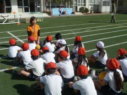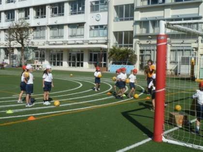 1年生は体育でボール蹴りゲームに挑戦中です。今までボールを蹴ったことのない子どもでも、ゲーム仕立てなので、楽しく運動することができています。