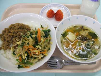 2月2日(水) 公開日 2011/02/03 更新日 2011/02/03 給食 今日のデザートはイチゴです。「さがほのか」という品種です。 九州の佐賀県から届きました。イチゴは、春の果物でしたが、 最近は、ビニールハウスの中であたたかくして育てるので、寒い 1月〜2月にもおいしいイチゴがたくさん食べられるようになりました。 あまずっぱいイチゴを食べて、春を待ちましょう。 献立 :ビビンバ もずくスープ いちご 牛乳 いいね(0)