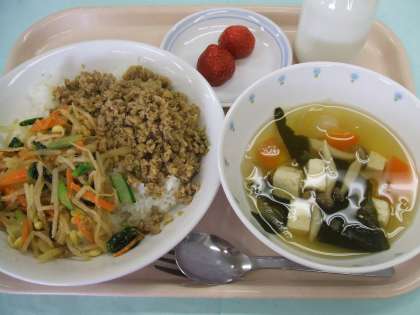 3月8日(火) 公開日 2011/03/09 更新日 2011/03/09 給食 もうすぐ6年生が卒業します。 6年生が今まで食べた給食の中から、もう一度食べたい思い出のメニューを えらんでもらいました。 今日は、あすなろクラスの6年生の思い出メニューです。 ビビンバもいちごも人気のメニューですね。 みんなでおいしく食べてください。 献立 :ビビンバ わかめスープ いちご 牛乳 いいね(0)