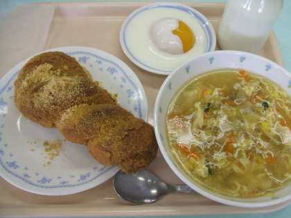 3月14日(月) 公開日 2011/03/16 更新日 2011/03/16 給食 みなさんの大好きな揚げパンは、学校給食で考えられたアイディアメニューです。 昔の給食では、ごはんよりもパンの日が多かったので、同じパンをあきずに 食べられるように、おいしい食べ方をいろいろ考えました。 みなさんのお父さんやお母さんも子どものときに食べたことがあるかもしれません。 みなさんも揚げパンを給食の思い出のひとつにしてください。 献立 :きなこ揚げパン コーンと卵のスープ モンブランピーチ 牛乳 いいね(0)