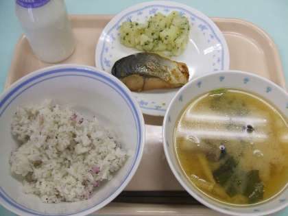 献立 :ゆかりごはん かぶのみそ汁 イナダの照り焼き こふき芋 牛乳