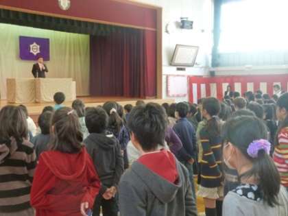 平成22年度最後の日、1年生〜5年生までが修了式に出席しました。各クラスの代表が修了証を受け取り、そして1年の代表の児童がりっぱなあいさつをしました。どの学年も本当によく努力し、よく協力し、輝いた1年でした。進級おめでとう。