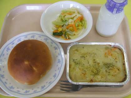 4月11日(月) 公開日 2011/04/11 更新日 2011/04/11 給食 今日から1年生も給食が始まりました。今日は、1年生も食べやすい みんなのだ好きなメニューです。 食べおわったグラタン容器は、ちいさくたたんで返してください。 食べきれなかった時は、そのまま、そっとバットのはじに反しましょう。 献立 :パインパン グラタン フレンチサラダ 牛乳 いいね(0)
