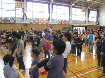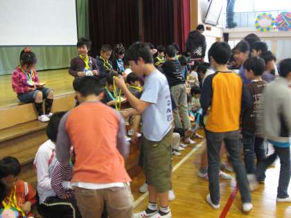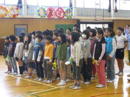6年生は、4年生や5年生が行ってくれるゲームを、1年生とペアになりながらいっしょに楽しみました。『次は○と×どっちだと思う?』とやさしく聞いたり、『3人組になるよ!』とリードしたりしていました。