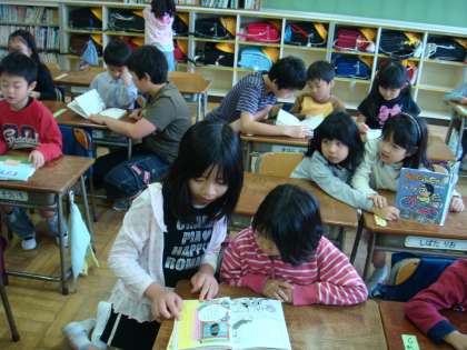 1年生の朝の教室には、毎日6年生がお世話に来てくれます。